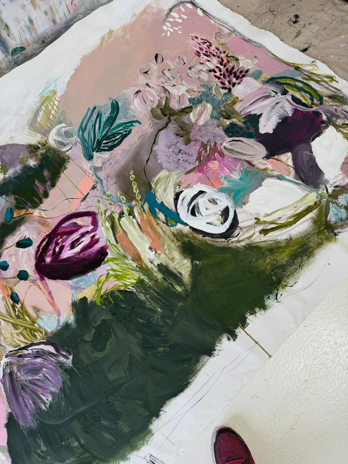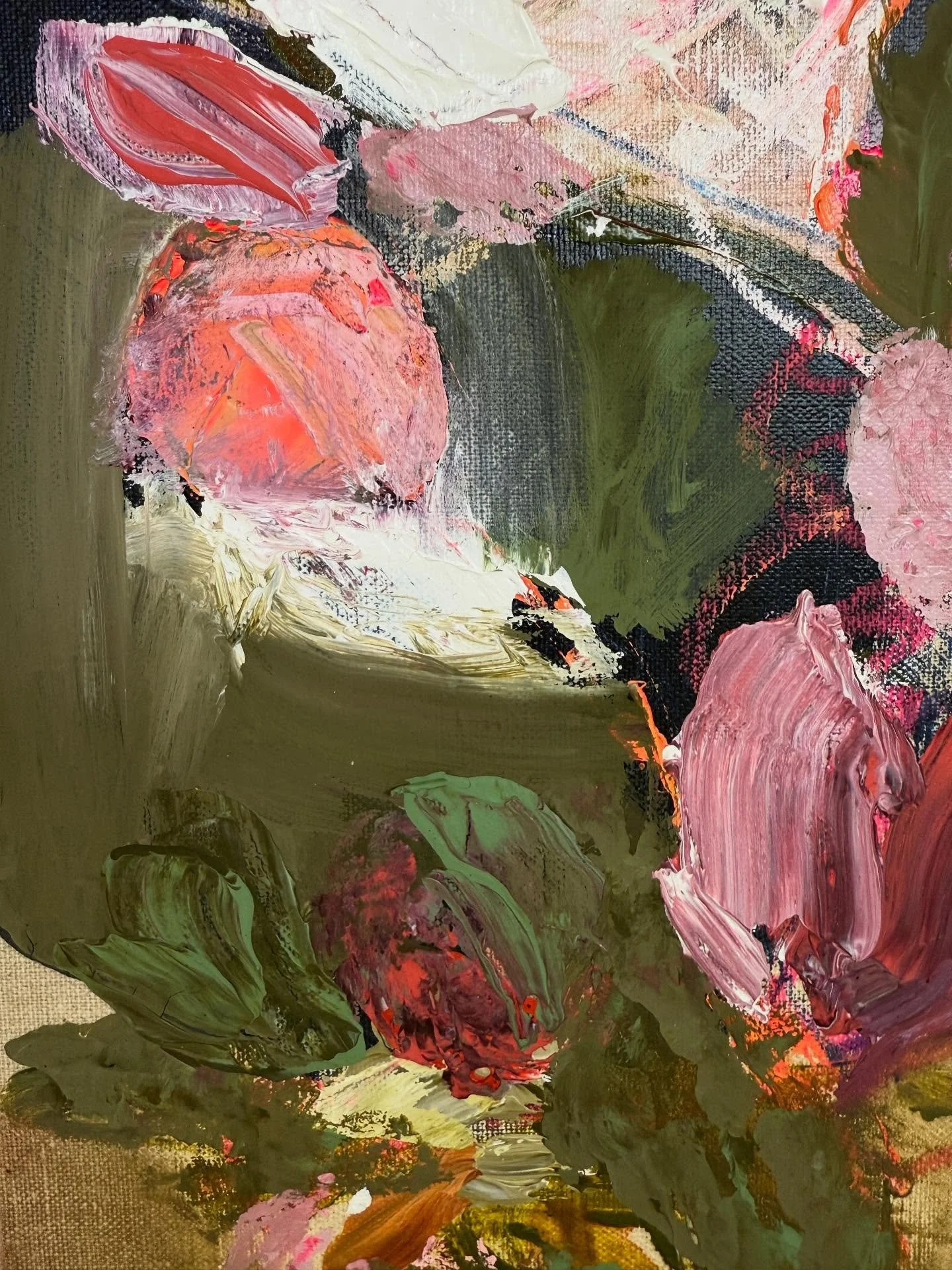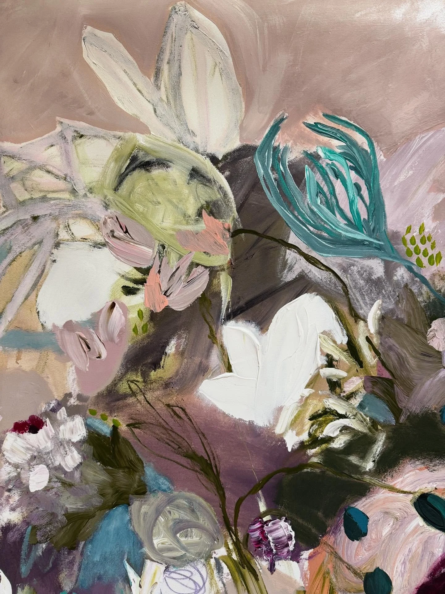 My current work is very emotive and intuitive. I only plan the colours, from there I let my feelings and creativity fly. Once purely abstract, the flowers emerged and they now come liberally. Botanical, loose abstracts are my joy, the flowers representing freedom and a return to a whimsical, child-like time. The combination of soft versus bold, dark versus light, portrays the way I want to be seen and how I feel I fit in the world. My message is to encourage a return to simplicity, without losing momentum and character. Beauty in nature reminds us of this.